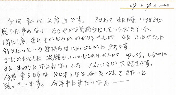 ◆塩原温泉 四季味亭ふじやお客様の声4月20日~5月1日ご宿泊のお客様 2015.05.01 | お客様の声 K様より ありがとうございました。 S様より ありがとうございました。 芳賀様より ありがとうございました。 TN様より ありがとうございました。 EN様より ありがとうございました。 塩原温泉 四季味亭ふじや